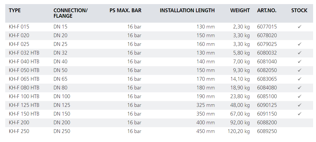 Marchel 法蘭球閥 PS16bar KH-F系(xi)列球閥 認證(zhèng):壓力設備指(zhi)令 2014/68/EUDVGW-G (DIN EN 13774)用于根據(jù) DVGW實踐規範 G 260手(shǒu)動關閉氣體(ti),空氣和水,PS max. 16 巴(bā)PS 16 = PS 最大值。16 bar, TS –20°C 至 +60°CHTB PS max. 5 巴(bā) (GT5) DN 32 - DN 150DN 250 方式減少到(dao) DN 200